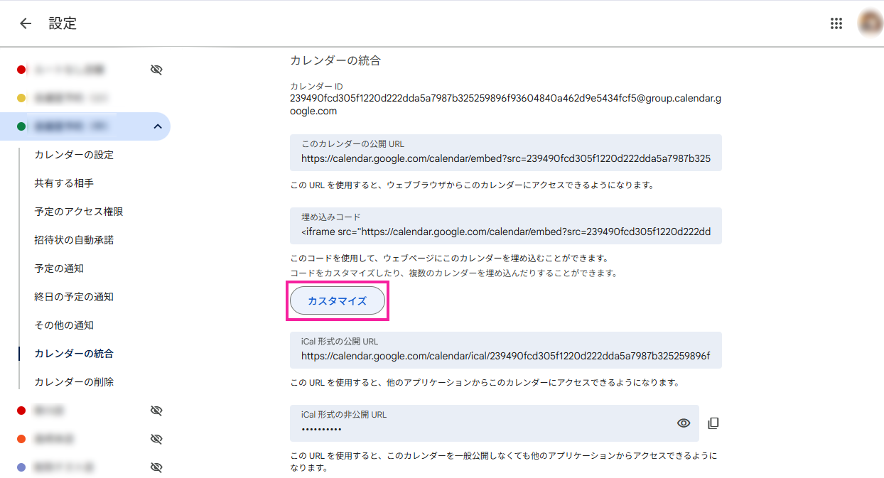 - カレンダーの設定画面から「カレンダーの統合」項目で「カスタマイズ」ボタンをクリックします。