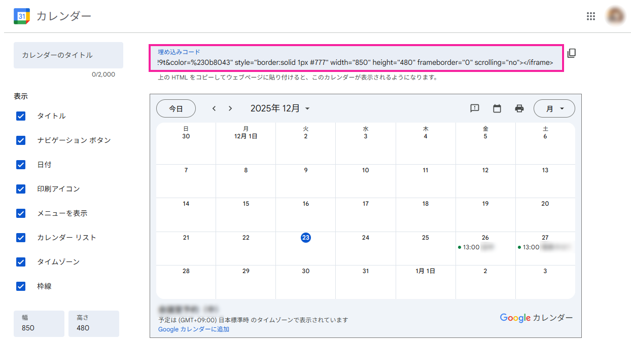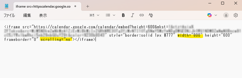 コピーした「埋め込みコード」を少し書き換えるだけで、より使いやすいカレンダーになります。