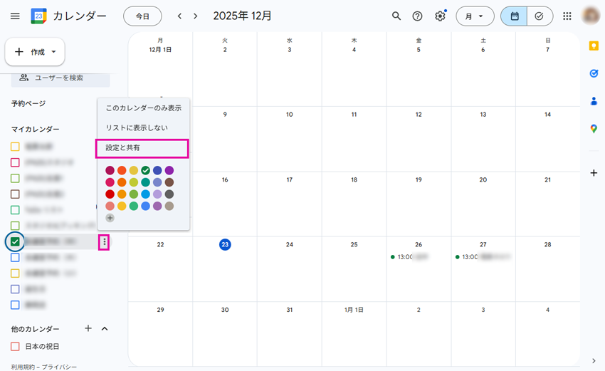 - マイカレンダーの中でtotoco-netと連携したカレンダー項目のメニュー(縦列の・・・)をクリックします。